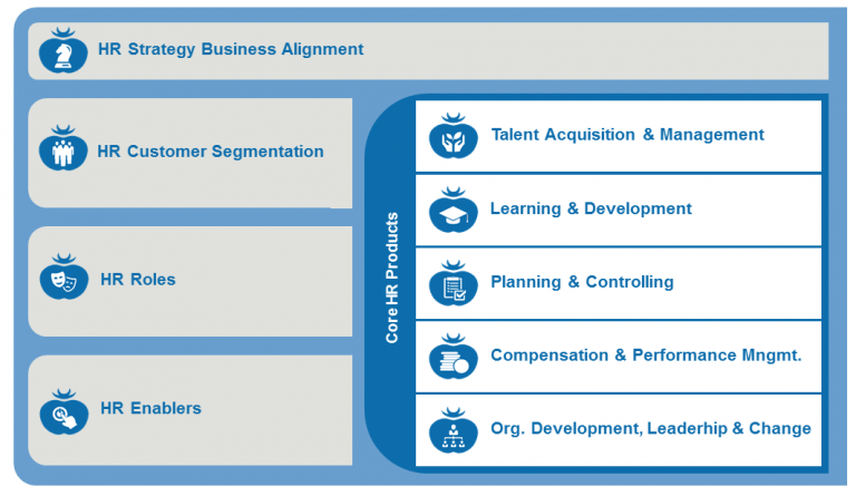 - Die fünf HR-Kernprodukte erfassen die Dienstleistungen, mit denen die meisten HR-Abteilungen ihren Wertbeitrag generieren: Talentmanagement (Talent Acquisition & Management), Entwicklung (Learning & Development), Planung (Planning & Controlling), Vergütung und Leistungsmanagement (Compensation & Performance Management), Organisationsentwicklung (Organizational Development) und Führung (Leadership & Change).
